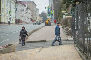 С чётной стороны Горького строители продолжают укладывать тротуар. На местах наиболее крутого подъёма подрядчик делает лестницы. Для пешеходов здесь выделили полосу движения автомобилей, огородив её пластиковыми барьерными блоками.